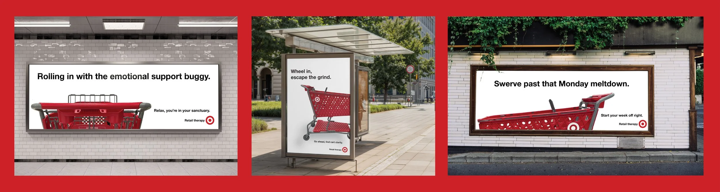 An OOH campaign highlighting Target's lighthearted, playful shopping experience. From your favorite frozen pizza to dog cookies and stylish silky sheets, Target has it all. A quick stroll behind a buggy for a therapeutic getaway is always the right answer.